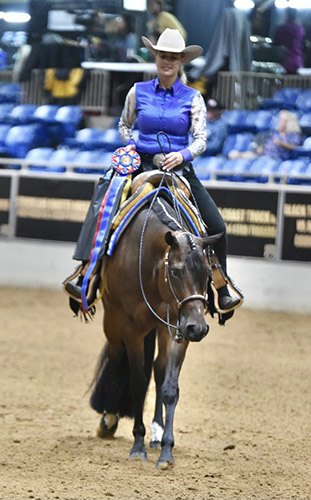 Hillary Roberts had a busy afternoon. She showed Johnnie On The Spot to win the Color Amateur Western Pleasure world championship title by a unanimous decision, then returned to show Start Ur Engines to win the futurity title in the Breeders Championship Futurity Three Year Old Non-Pro Western Pleasure.